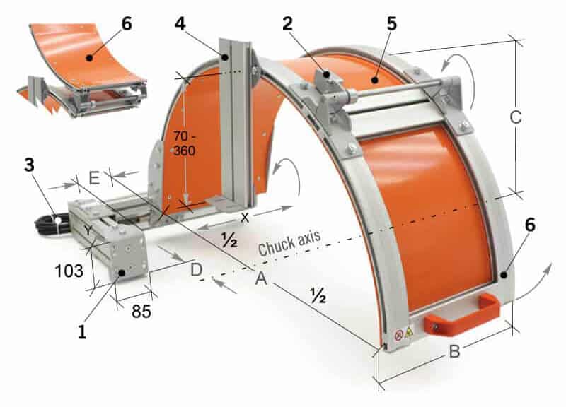 It protects the operator from direct contact with large-diameter chucks and shields against chips, coolant, and lubricants, while maintaining good visibility and easy access.